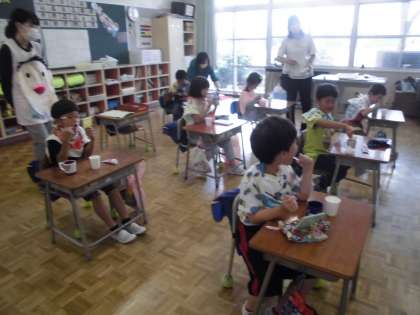 6月12日(月)1年生 今日の授業風景(歯みがき指導)