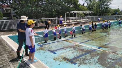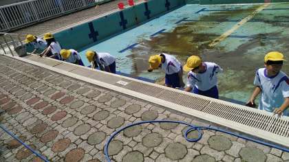 プール掃除も大詰めになってきました。今日は、6年生がプール本体の掃除をしました。たわしで丁寧にこすっていました。