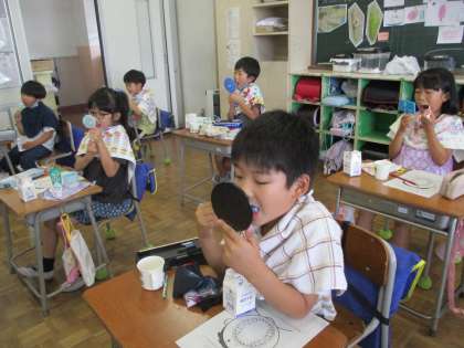 染め出しを行い、よく磨けている部分と、もう少し磨くとよい部分を観察しました。「歯ぐきの近くの部分がよくみがけていなかったよ」「歯を1本ずつ、歯ブラシを小さく動かすと、よごれが落ちたよ」「えんぴつの持ち方がみがきやすいよ」など、自分なりによりよいみがき方を考えました。そして、これからの歯みがきの目当てをもつことができました。