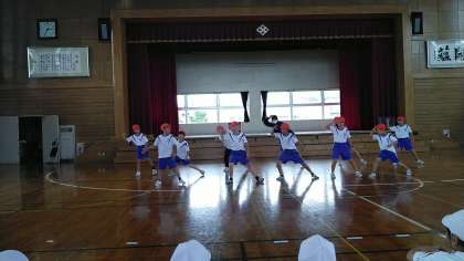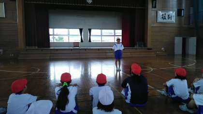 4年生の6時間目は、体育の学習でした。体育館でダンス発表会を行っていました。はじめの言葉のあと、赤団の発表がありました。