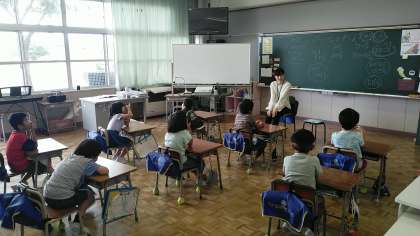 1年生は、2時間目に養護教諭からお話を聞いていました。昨日、プール開きもあったので、養護教諭から水泳学習についての話を聞いていました。