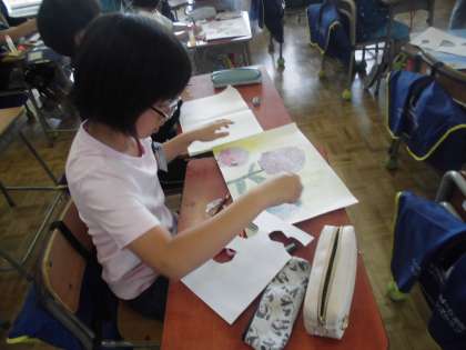 4年生の2時間目は、図画工作科の学習でした。描いたアジザイに、カタツムリをつけていました。一人一人、カタツムリの大きさや色が違い、とても素敵な作品に仕上げていました。