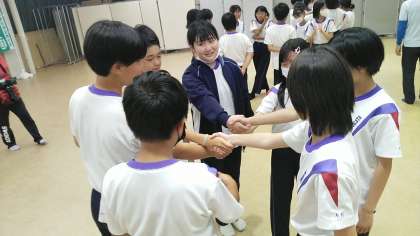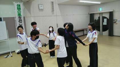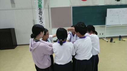 次は、「人間知恵の輪」というゲームを行いました。雨で、外での活動はできませんが、ちょっぴりひろめな101号室で6年生がますます仲よくなるプログラムを行っています。