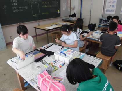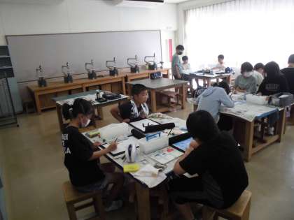 6年生の1時間目は、ミニ行灯づくりをしました。ミニ行灯は、7月31日に行われる「だらまつり」に飾られます。今日は、書道用半紙に絵や文字等を描きました。「さすが6年生」と思えるミニ行灯に仕上がりそうです。