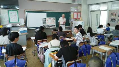 6年生の4時間目は、総合的な学習の時間でした。地域の方に来ていただいて、四方の大火について教えてもらいました。