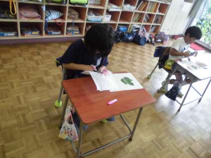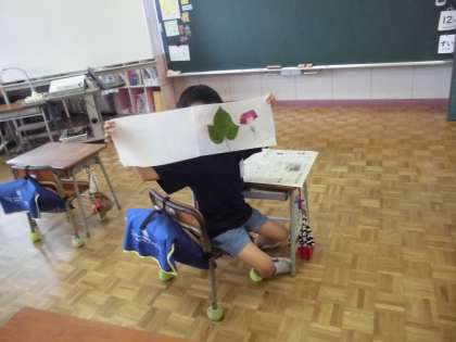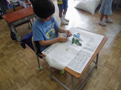 1年生の2時間目は、生活科の学習でした。育てているアサガオを押し花にしました。このあとラミネートして完成です。