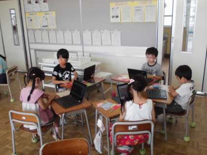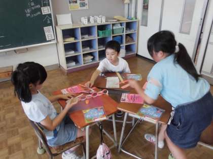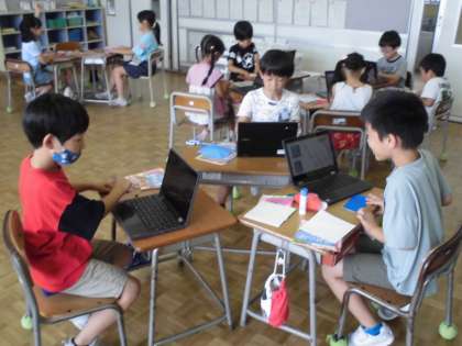 2年生の2時間目は、学級活動でした。お楽しみ会に向けて、それぞれのグループで飾り付けの準備をしていました。クロームブックでつくり方を検索しながら、みんなで楽しく取り組んでいました。