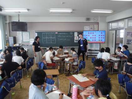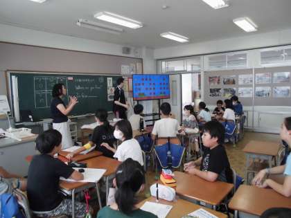 6年生の1時間目は、外国語の学習でした。1学期に学習したセンテンスを用いたゲームをしながら復習しました。マリオが登場するゲームだったので、子供たちも楽しんでいました。