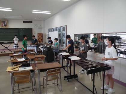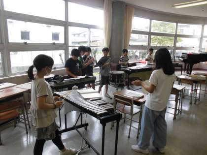 5年生の4時間目は、音楽の学習でした。2つのグループに分かれて合奏練習をしています。他の楽器のリズムと合うように頑張っています。