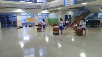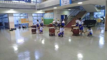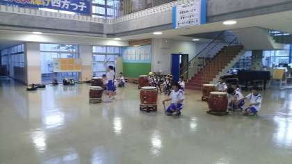 夕方、5年生の子供たちが学校に集まってきました。心に響く太鼓の音が聞こえてきました。今日は、栂彦祭です。準備を整えて、まもなく会場に向かいます。