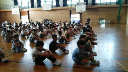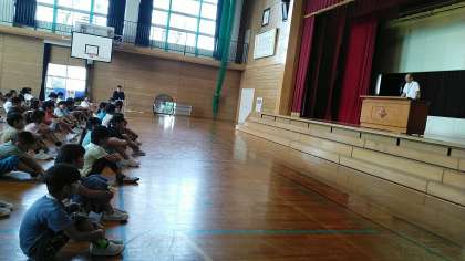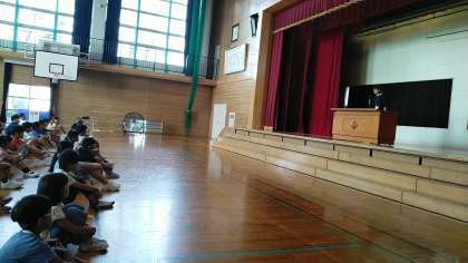 全校登校日で久しぶりに学校に子供たちが戻ってきました。全校集会では、