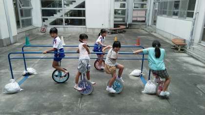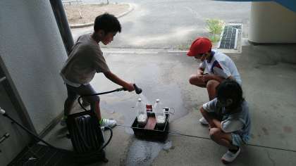2学期初めてのスマイルタイムでした。曇空で風もあったので、比較的活動しやすいのか、生き生きタイムより多くの子供たちが遊んでいました。中には、夏休みの自由研究でつくった水車の実演を友達に見せている子供もいました。