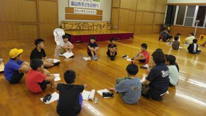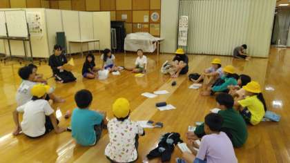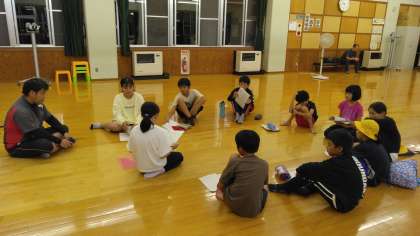 五右衛門風呂に入ってさっぱりした後、係の反省会をしています。