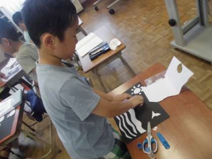 2年生の5時間目は、図画工作科の学習でした。白い画用紙を思い思いに切って黒い画用紙に貼り付けていきます。切った形が何に見えるのか考えながら、素敵な作品に仕上げていました。