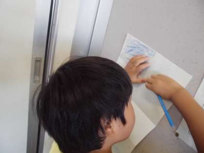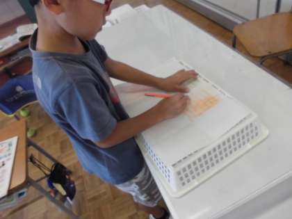 1年生の5時間目は、図画工作科「うつした かたちから」の学習でした。身の回りにある様々な形を紙で写し取り、その形の面白さを感じていました。