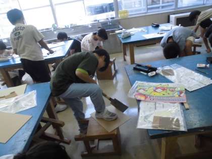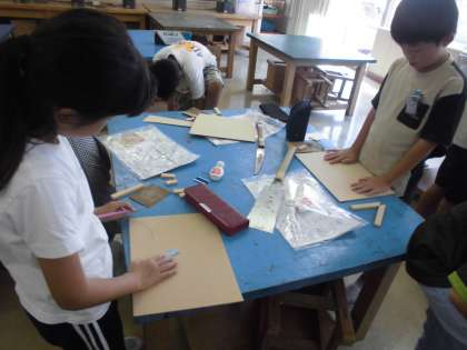 4年生の2時間目は、図画工作科の学習でした。のこぎりを使って板を切り、紙やすりで整えていました。作品の完成が楽しみです。