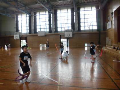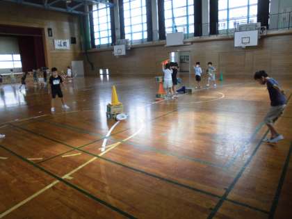 3年生の2時間目は、リボンやフリスビー型のボールを使って体を動かしました。リボンが絡まらないように動かしたり、的をつくってボールをけったりしました。友達と遊びを工夫して、たくさん汗をかきながら運動を楽しみました。