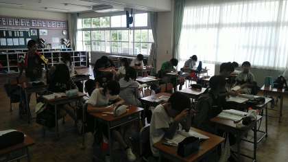 6年生の5時間目は、算数の学習でした。友達と相談しながら学習を進めている子供もいました。