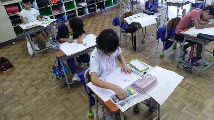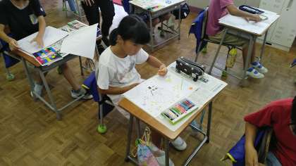 3年生の5時間目は、図画工作科の学習でした。連合音楽会で歌う「気球に乗ってどこまでも」の歌詞からイメージする世界を絵で表現していました。