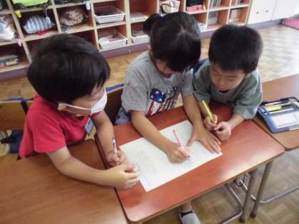1年生の2時間目は、国語の学習でした。たくさんの言葉から、言葉見付け問題をつくりました。「動物」というテーマで問題をつくる子供やたくさんの問題をつくる子供等、子供たちは楽しく言葉の学習に取り組んでいました。