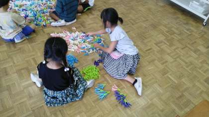 1年生の4時間目は、図画工作科の学習でした。前の時間に洗濯ばさみでつくったものをパワーアップする話合いをしたあと、男子と女子に別れてお花やドラゴンをつくっていました。