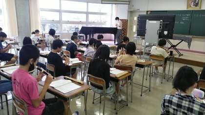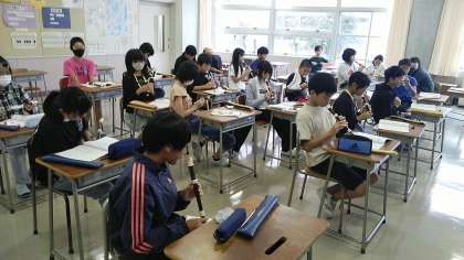6年生の2時間目は、音楽科の学習でした。音楽室で「風をきって」という曲のリコーダー練習をしていました。