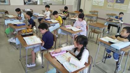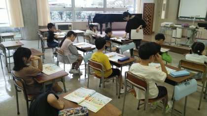 2年生の4時間目は、音楽科の学習でした。音楽室で「トルコ行進曲」という曲を聴いて、繰り返しのフレーズを見付けていました。