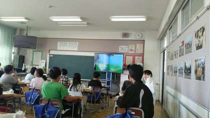 給食の時間に、図書館司書の京谷先生の読み聞かせがありました。クロームブックを使って、教室で聴いて(見て)います。写真は、6年生教室の様子です。