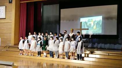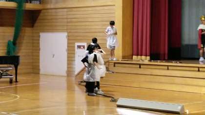 6年生の6時間目は、体育館で劇の練習でした。衣装もかなりできあがっています。