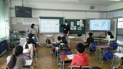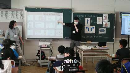 5年生の2時間目は、外国語科の学習でした。地図を見ながらピカチュウの隠れている場所を選んで、そこまでの道順を英語で答えていました。