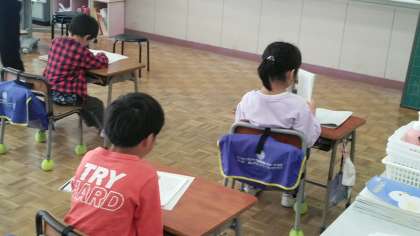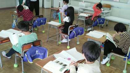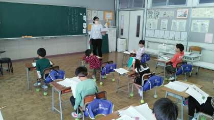 1年生の1時間目は、国語学習でした。「うみのかくれんぼ」というお話の学習で、みんなで声をそろえて文を読んでいました。