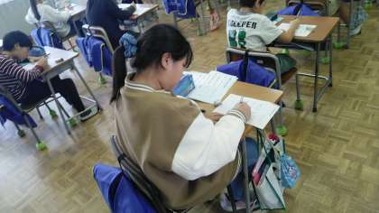 5年生の5時間目は、書写の時間でした。片仮名の筆遣いについてのプリントに取り組んでいました。