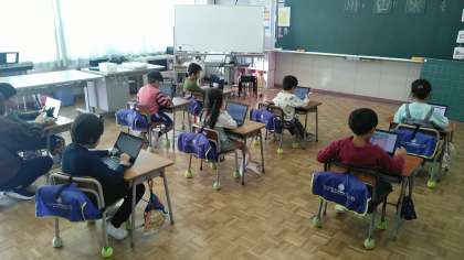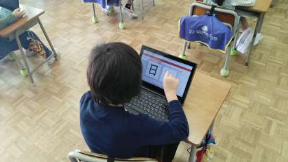 1年生の1時間目は、国語の学習でした。見に行ったときは、ちょうどクロームブックで漢字の練習をしているところでした。クロームブックを上手に使って漢字の練習をしていました。