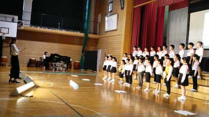 次は、2・3年生の「気球にのってどこまでも〜世界音楽旅行〜」です。きれいな歌声が体育館に響いていました。