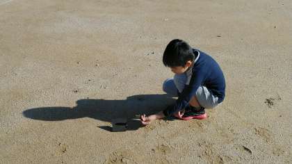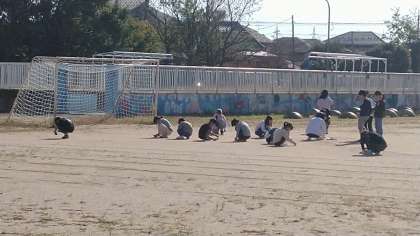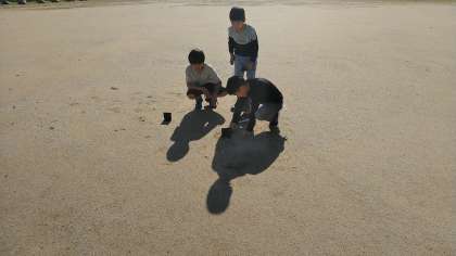 1時間目にグラウンドを見ると、3年生が何やらやっていました。近寄ってみると、虫メガネで太陽の光を集めて黒い紙を焦がしていました。