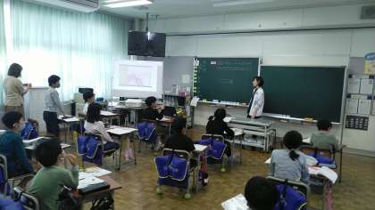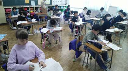 3年生の2時間目は、算数科の学習でした。画ビョウと紙を使ってノートに円をたくさん描いていました。描いた円を見ながら、半径がみんな同じ長さということに気付いていました。
