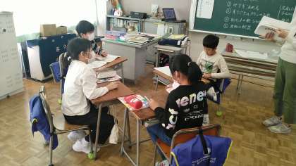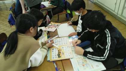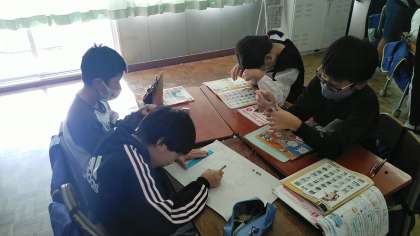 5年生の2時間目は、外国語科の学習でした。グループごとに町の名前を決めたあと、自分の家までの案内を英語で考えていました。