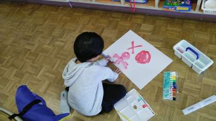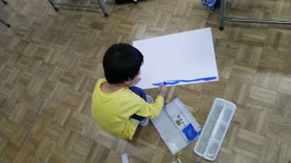 5時間目の図画工作科の学習の最後の方で、どうしても水彩道具を使いたいという子供が多数いたので、ちょっとだけ水彩道具を使って絵を描いてみることにしました。すると、とても嬉しそうにハートを描いたり、海を描いたりする子供がいました。自分で筆や色を選んで描きたいものを描く主体的な子供たちばかりでした。