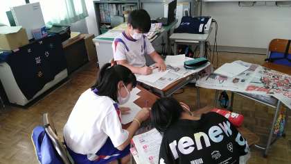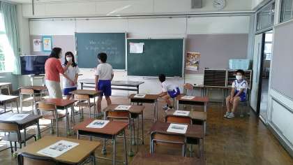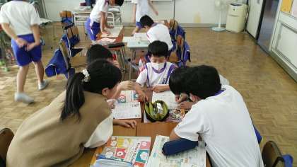 5年生の1時間目は、外国語科の学習でした。マイハウスへの行き方をグループで考えたあと、外国語専科の先生の前で、発表のリハーサルをしていました。