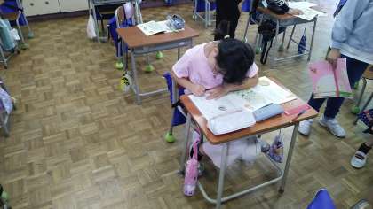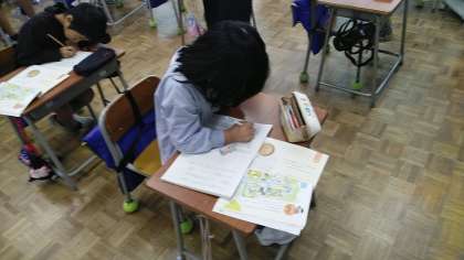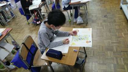 3年生の1時間目は、国語科の学習でした。教科書のに描かれている地図の中の漢字をいくつか使って、主語と述語のある文章を考えていました。