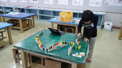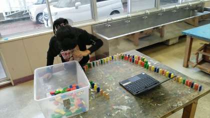 あすなろ級の6時間目は、図画工作科の学習でした。同じ長さの木のパーツをどんどん並べて色の変化を楽しんでいました。