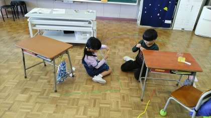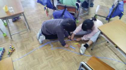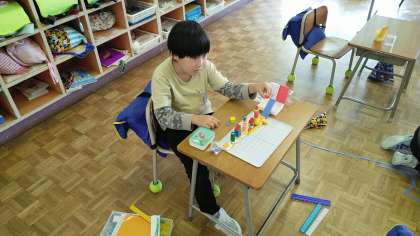 1年生の4時間目は、算数科の学習でしたが、たし算の問題が早く終わったので、算数セットで遊んでいいよということにしました。すると、かぞえ棒をどんどんつなげたり、ブロックをどんどん積んだりするなど、まるで図画工作科の造形遊びのようでした。