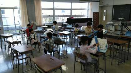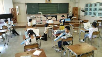 1年生の1時間目は、音楽科の学習でした。鍵盤ハーモニカのいろいろな吹き方を試してみながら、楽しく活動していました。