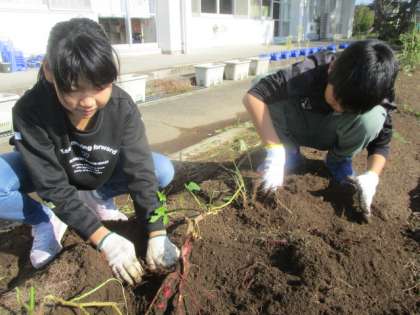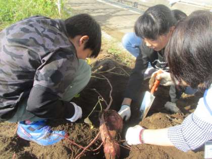 10月26日2時間目に、さつまいもを掘りました。土の中を掘ってみると、大きなおいもがいくつも出てきて、子供たちも驚いていました。おいもを折らないように手で土をかき分けたり、そっとおいもを引っ張ったりして、上手に掘ることができました。「早く食べたいな」「スイートポテトを作りたいな」と、食べるのを楽しみにしている様子が見られました。