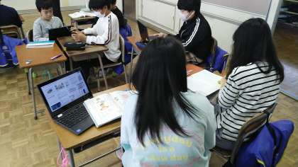 5年生の1時間目は、国語科の学習でした。自分の考えにあった資料をクロームブックを使って探していました。