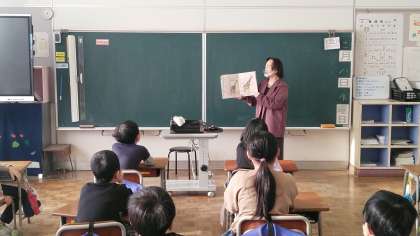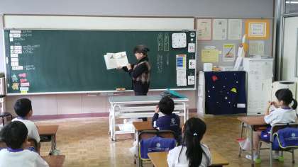 今日は、低学年の読み聞かせの日でした。今日も、ボランティアの布目先生と熊野先生のお話を真剣に聞いている子供たちでした。