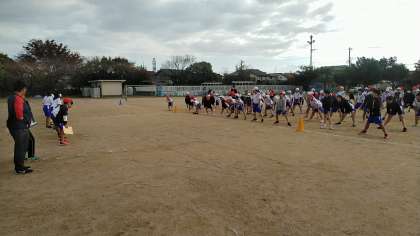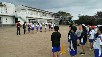 校内マラソン大会の日です。開会式の後、準備運動をしました。まもなく1・2年生のスタートです。