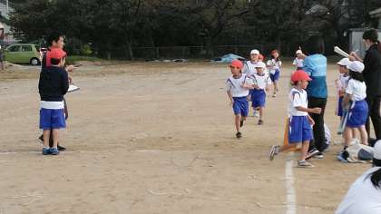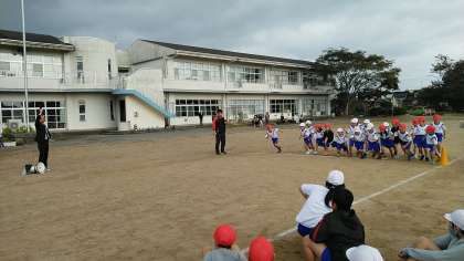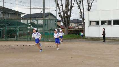 1・2年生がスタートしました。スタート→トラック3/4周→校舎の周り→トラック3/4周→ゴールの約600メートルです。