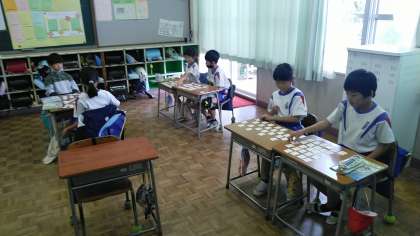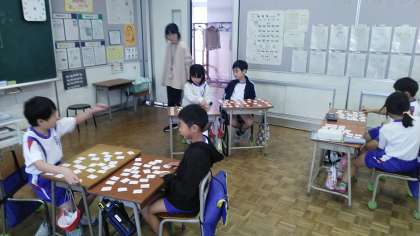 4時間目に3年生教室を覗くと、2人(一部3人)でカードゲームをしていました。聞いてみると、アルファベット神経衰弱だそうです。みんな楽しそうでした。