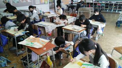 4時間目の6年生は、絵を描いていました。校舎の絵もそろそろ完成に近付いてきました。